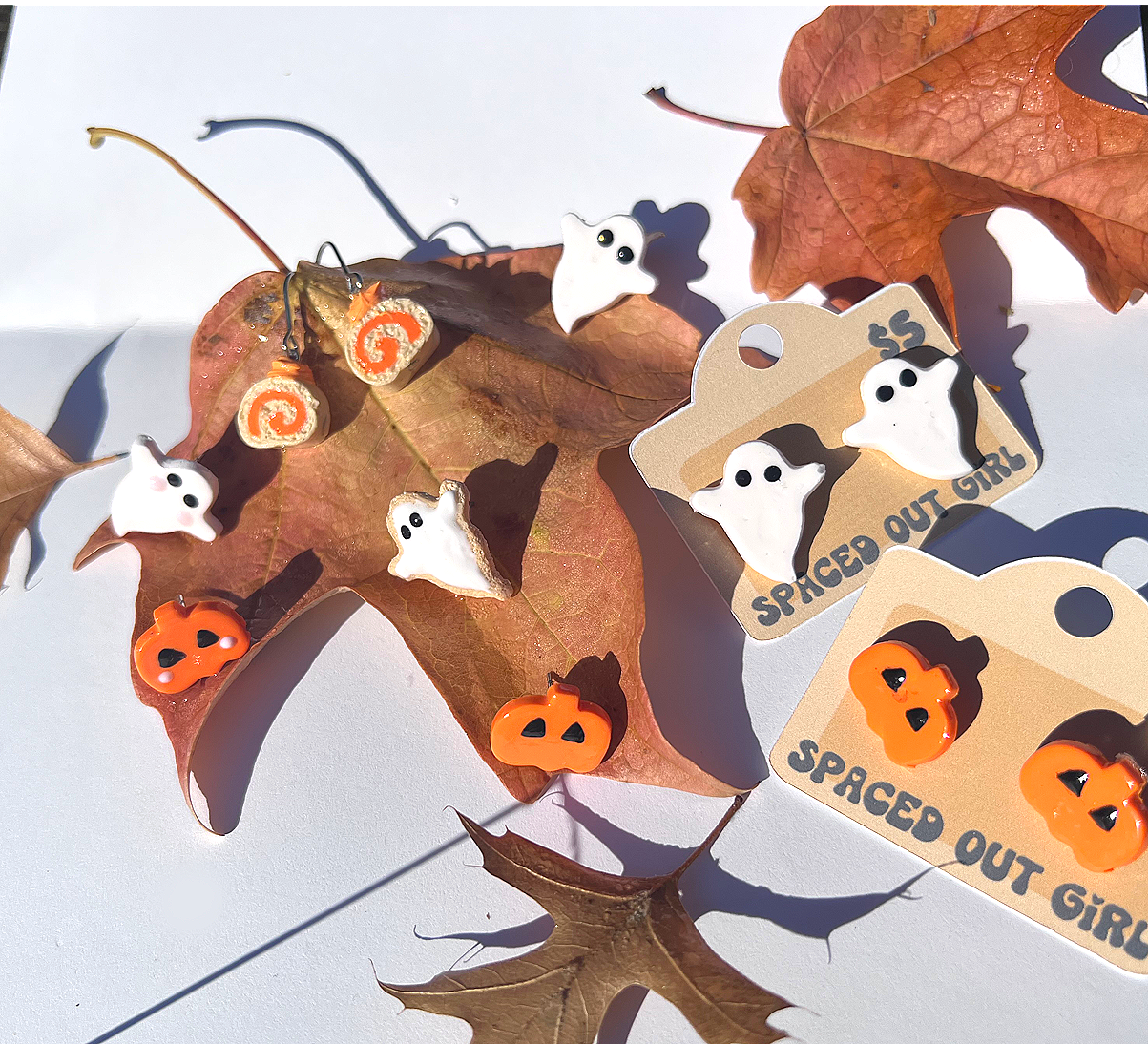 Halloween 2023 collection. Haunted bakery; including classic ghost studs with blushing ghost...